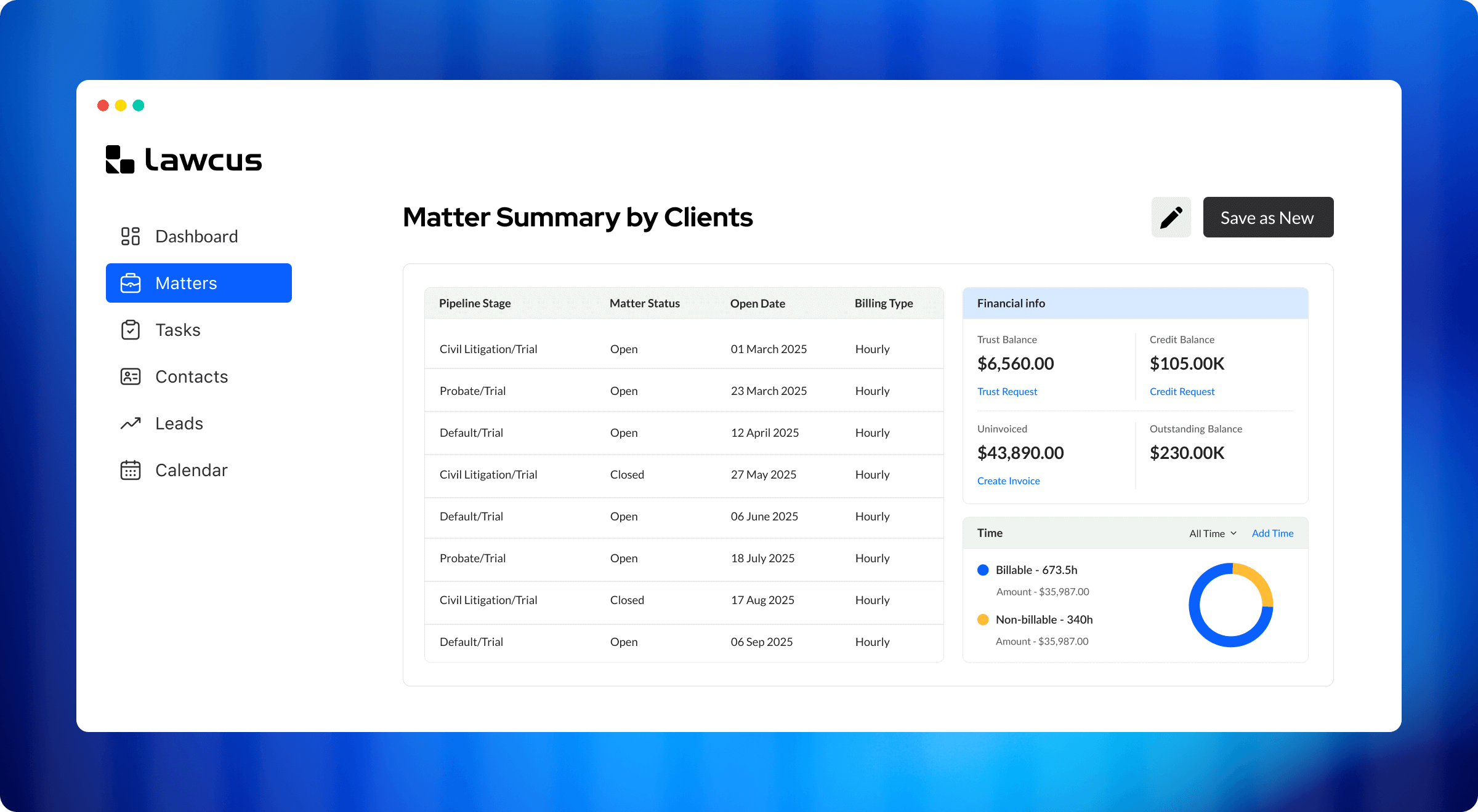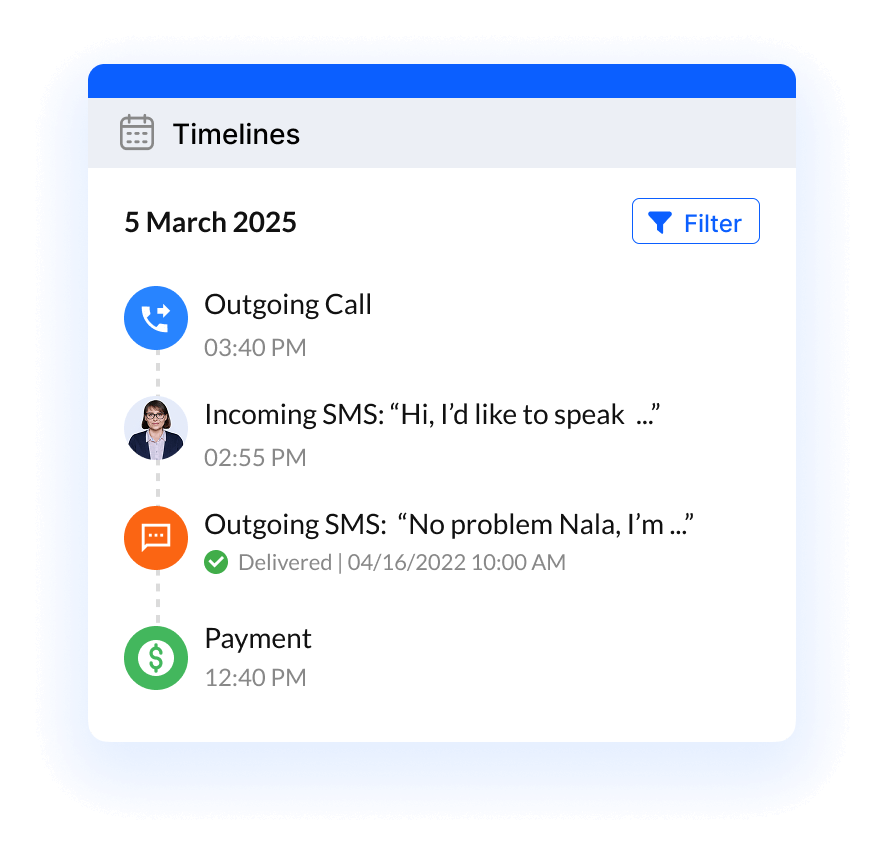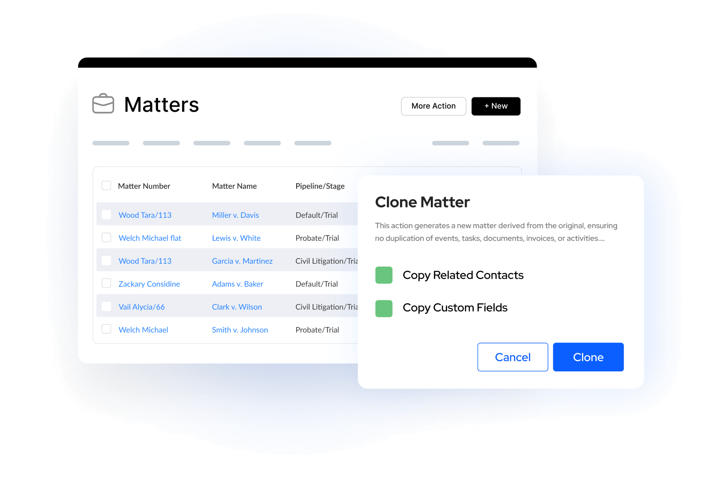 Record and organize key matter-related events, including phone calls, meetings, facts, and issues. The searchable and filterable activity stream lets you quickly find specific entries by type. Stay informed, aligned, and audit-ready.