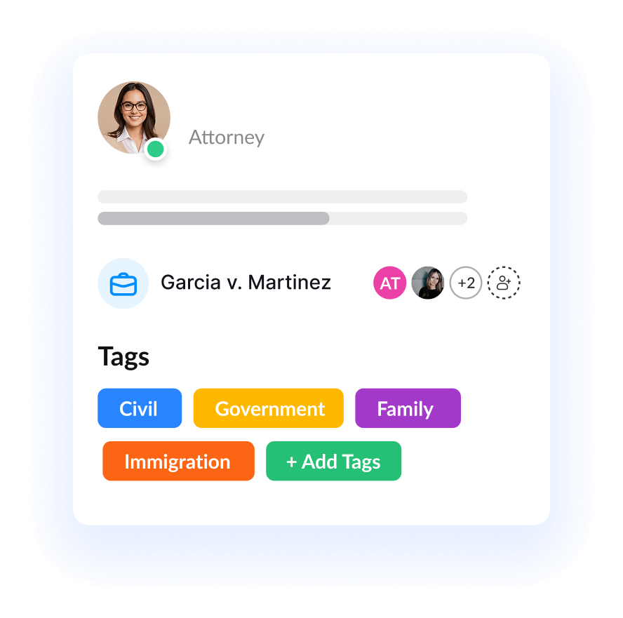 Tags give your firm added flexibility to organize matters and contacts beyond standard fields. Use tags as custom labels to group cases by client type, urgency, jurisdiction, or any criteria that fit your workflow.