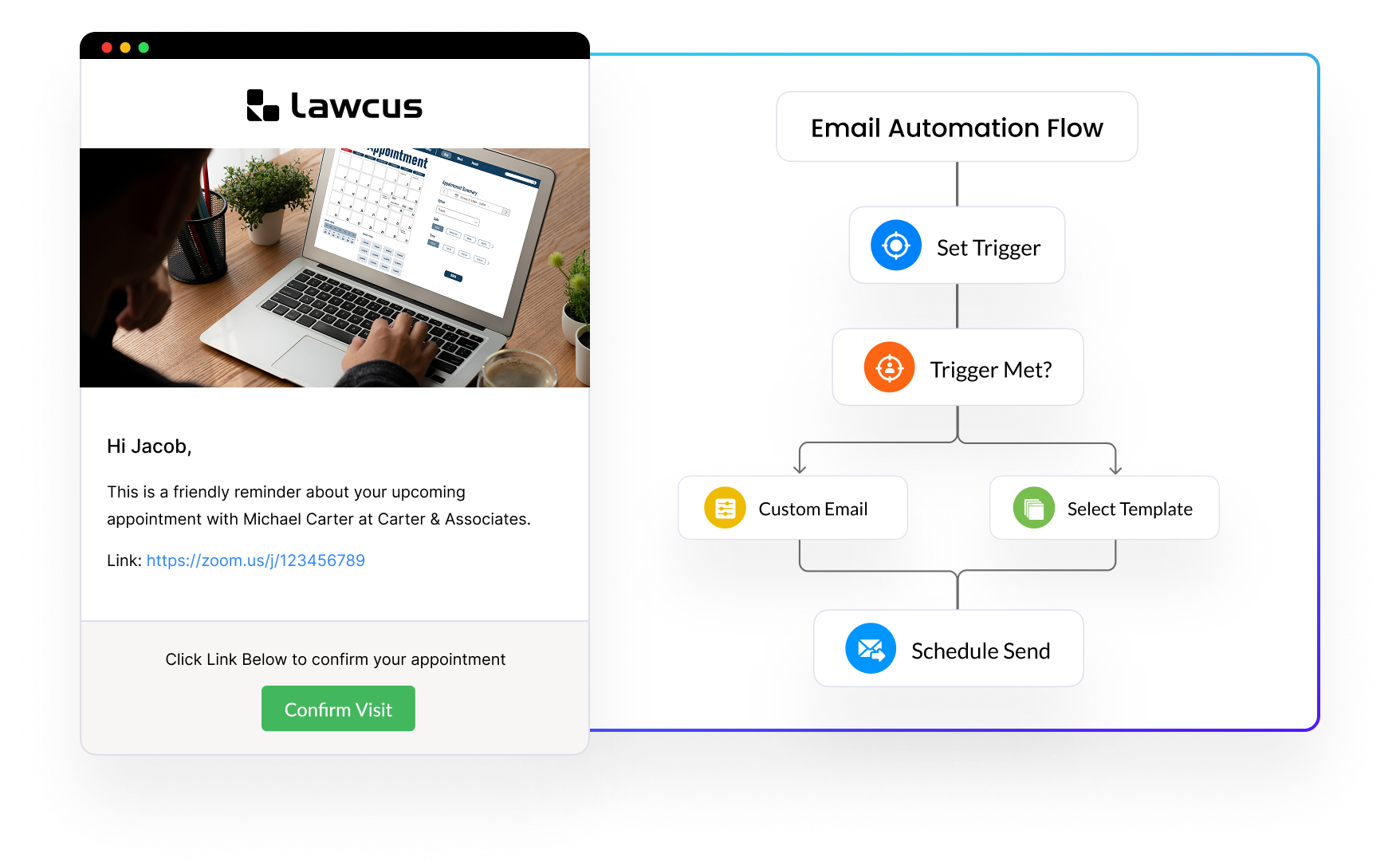 Streamline your follow-up process by sending personalised, scheduled and targeted emails automatically with the help of pre-set triggers. Lawcus helps you nurture your leads and engage with clients when it’s most important with it’s Email Automation Software.