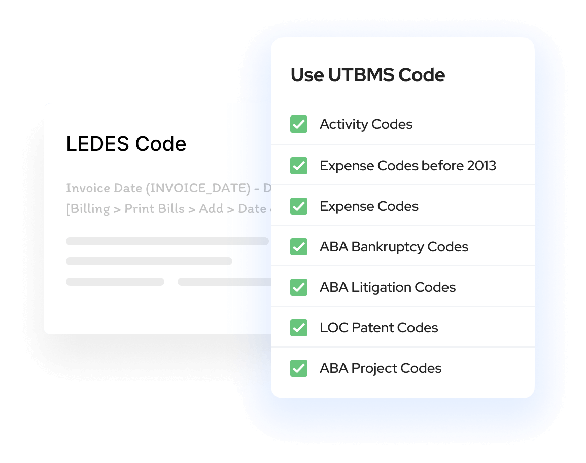 Enable UTBMS codes for time and expense entries. Generate LEDES-compliant invoices effortlessly, ensuring accuracy, transparency, and compliance with client billing guidelines.