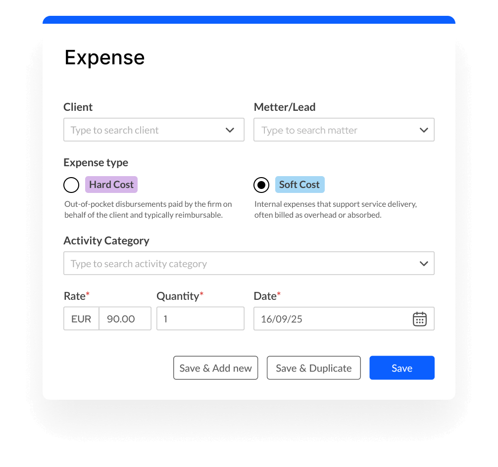 With the #1 Expense Tracking Software, log matter-related expenses in seconds and link them directly to matters. Bill clients accurately, recover costs faster, and keep your firm’s finances organized.