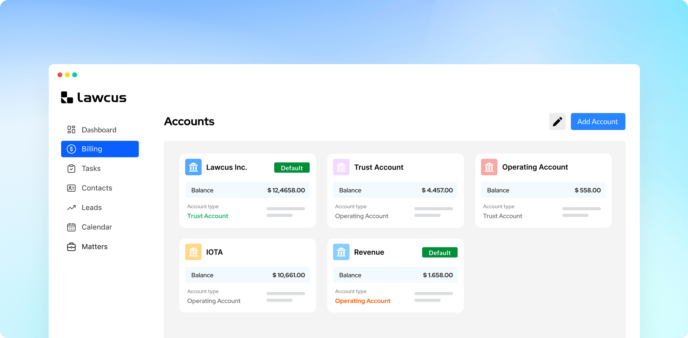 Lawcus gives you the ability to add multiple operating and trust accounts and also let’s you transfer funds between accounts.